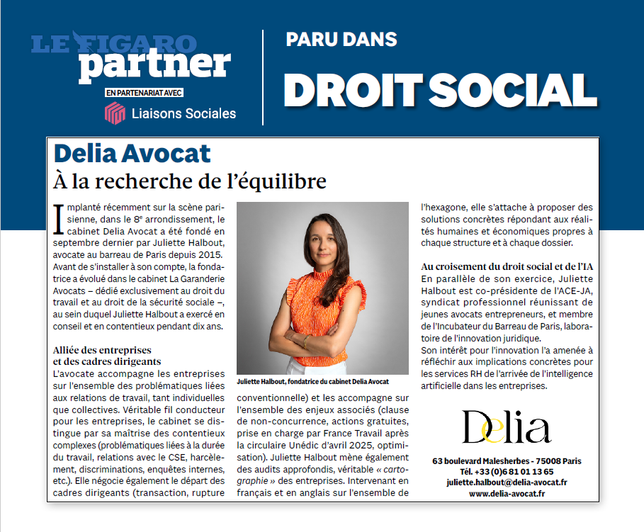 Fondé par Maître Juliette Halbout, Delia Avocat est un cabinet indépendant exclusivement dédié au droit social.